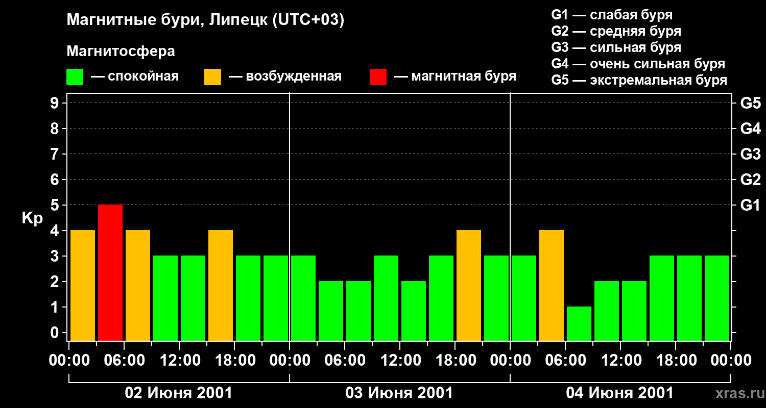 Изменения геомагнитного индекса Kp с 2 по 4 июня 2001 года для средних широт