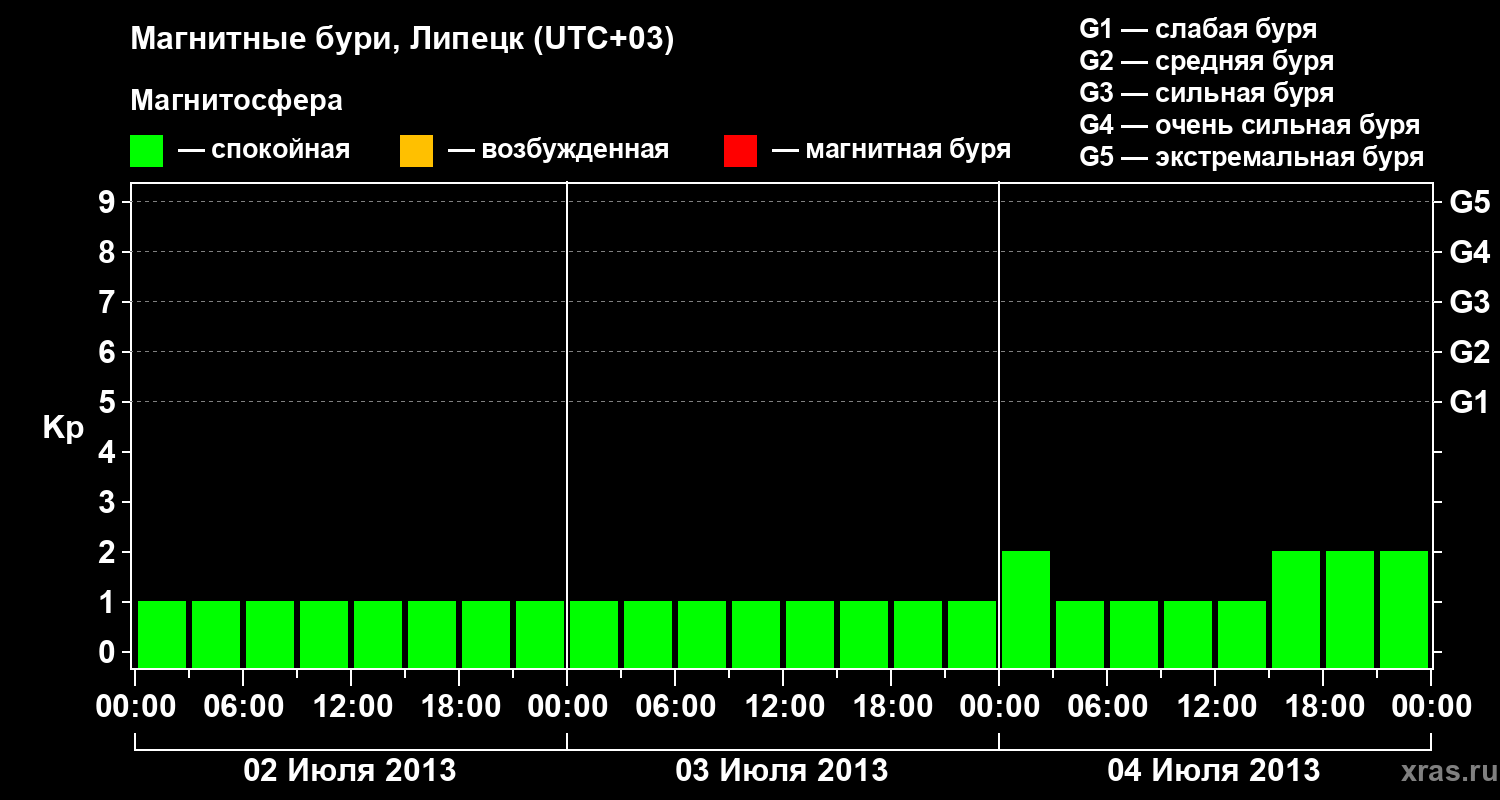 Изменения геомагнитного индекса Kp с 2 по 4 июля 2013 года для средних широт