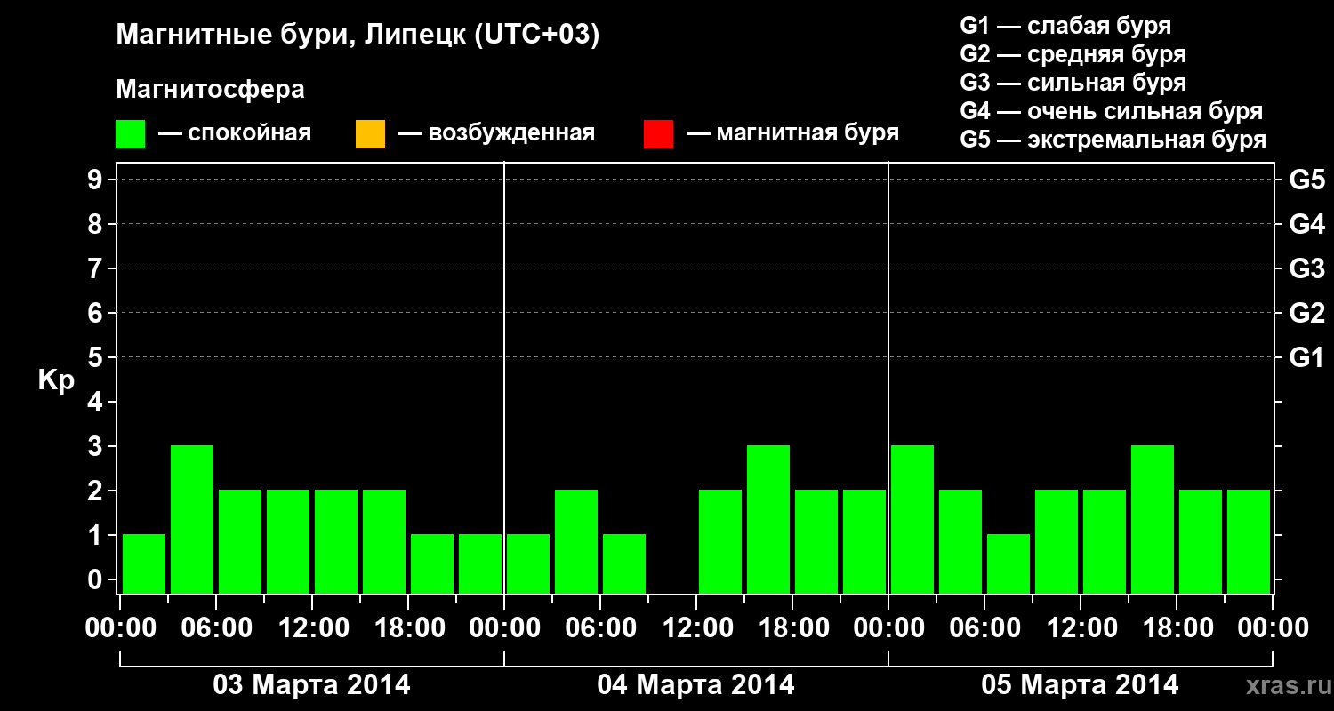 Изменения геомагнитного индекса Kp с 3 по 5 марта 2014 года для средних широт