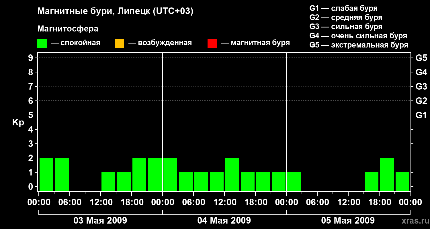 Изменения геомагнитного индекса Kp с 3 по 5 мая 2009 года для средних широт