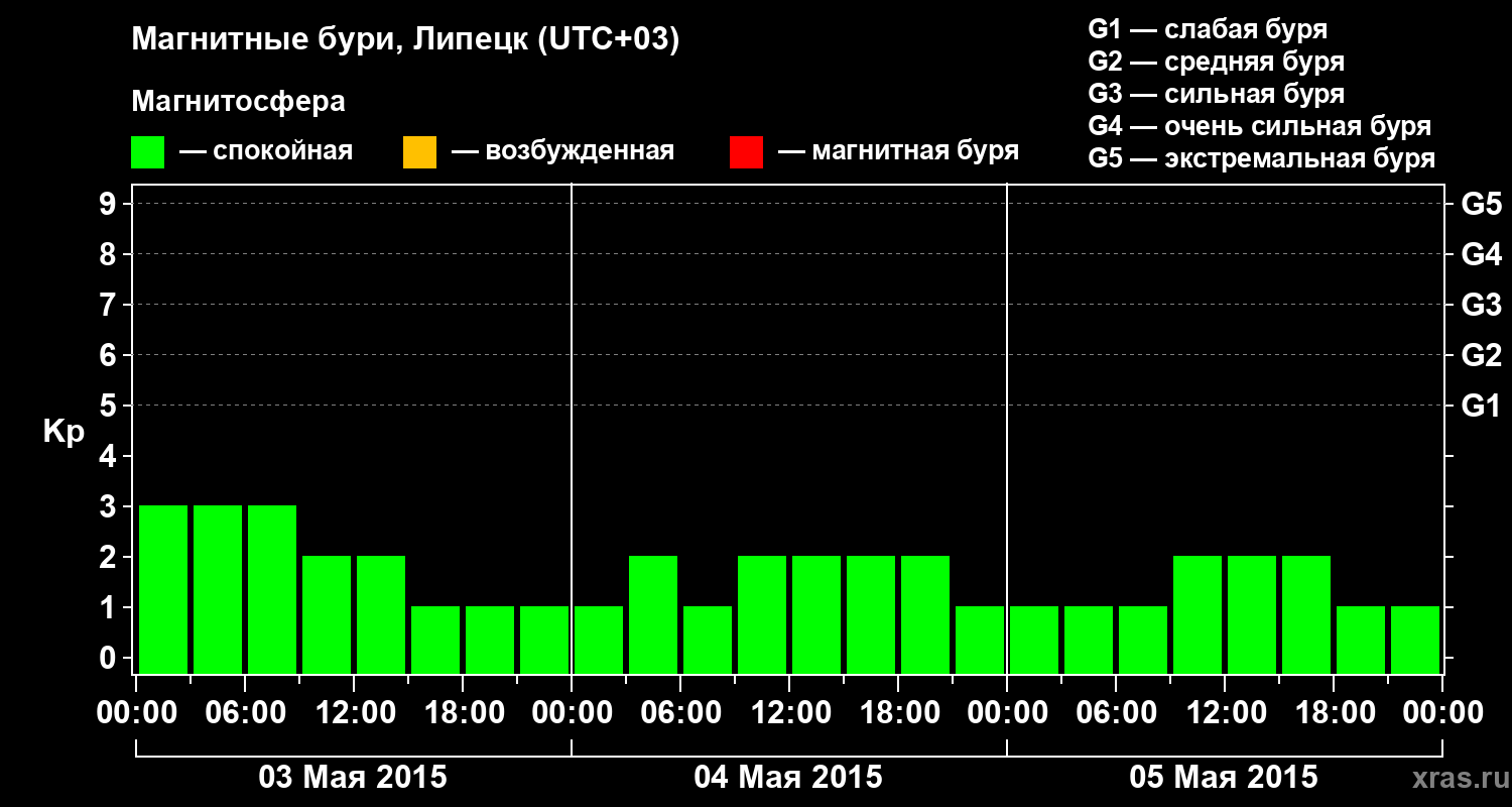 Изменения геомагнитного индекса Kp с 3 по 5 мая 2015 года для средних широт