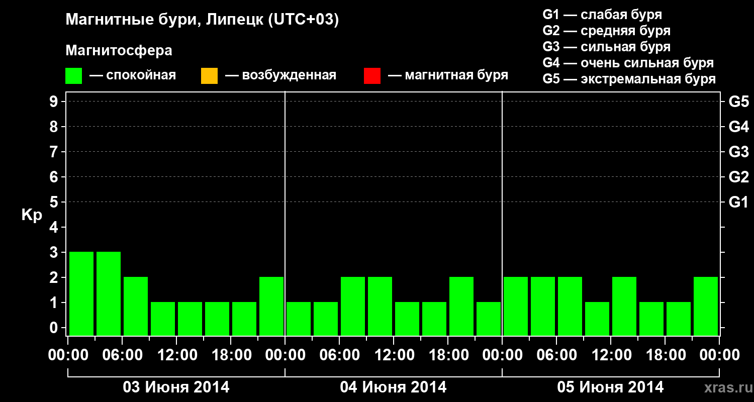 Изменения геомагнитного индекса Kp с 3 по 5 июня 2014 года для средних широт