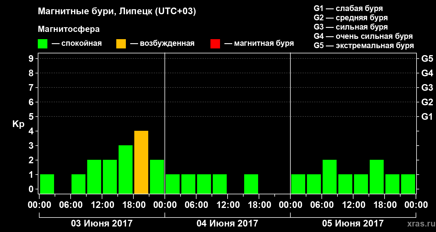 Изменения геомагнитного индекса Kp с 3 по 5 июня 2017 года для средних широт
