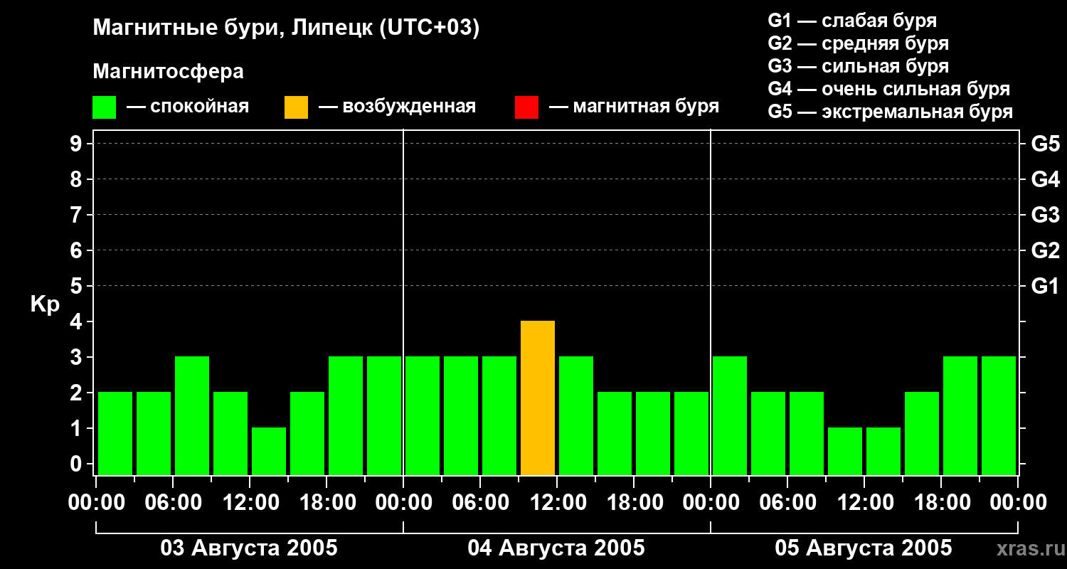 Изменения геомагнитного индекса Kp с 3 по 5 августа 2005 года для средних широт