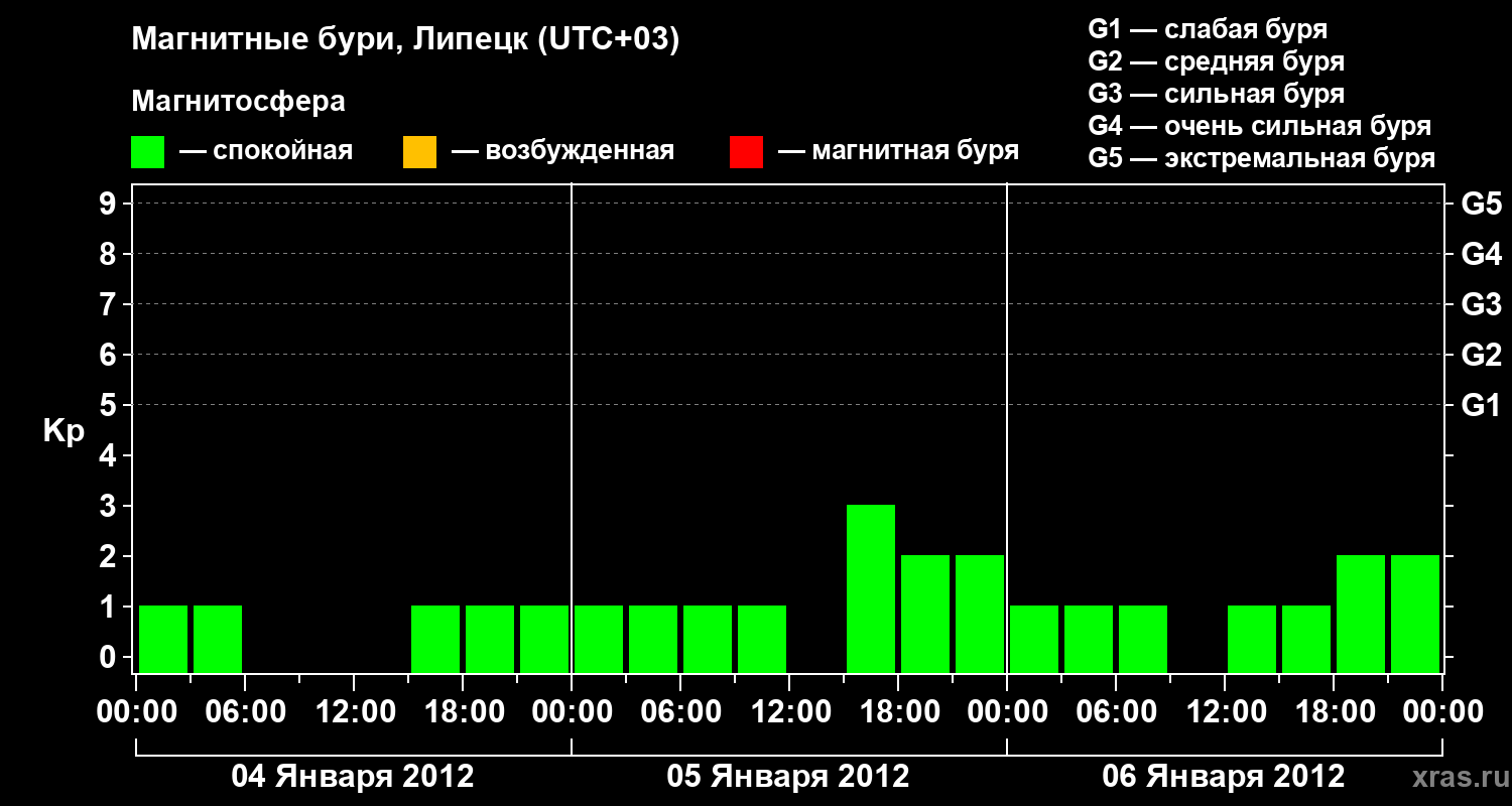 Изменения геомагнитного индекса Kp с 4 по 6 января 2012 года для средних широт
