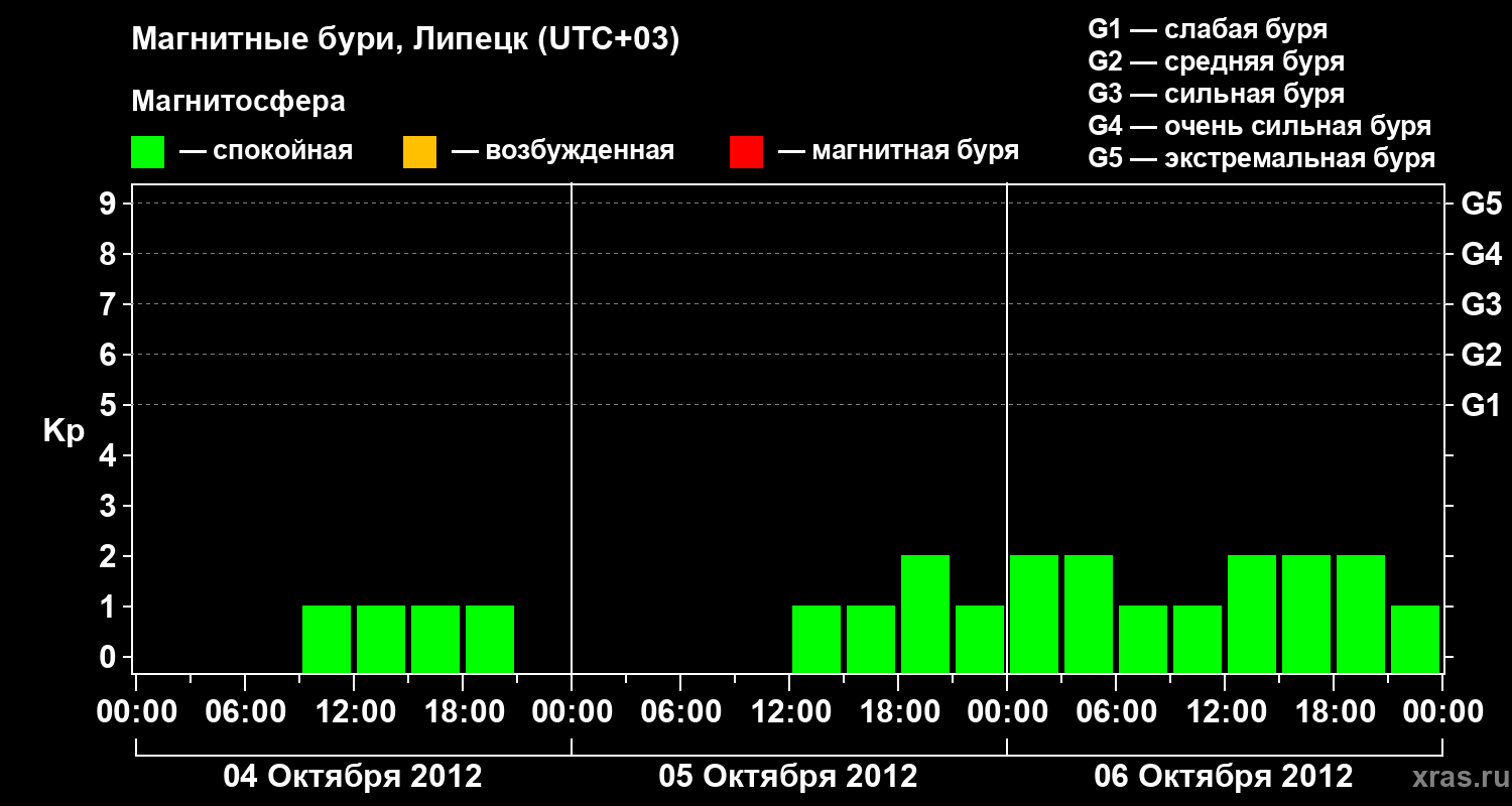 Изменения геомагнитного индекса Kp с 4 по 6 октября 2012 года для средних широт