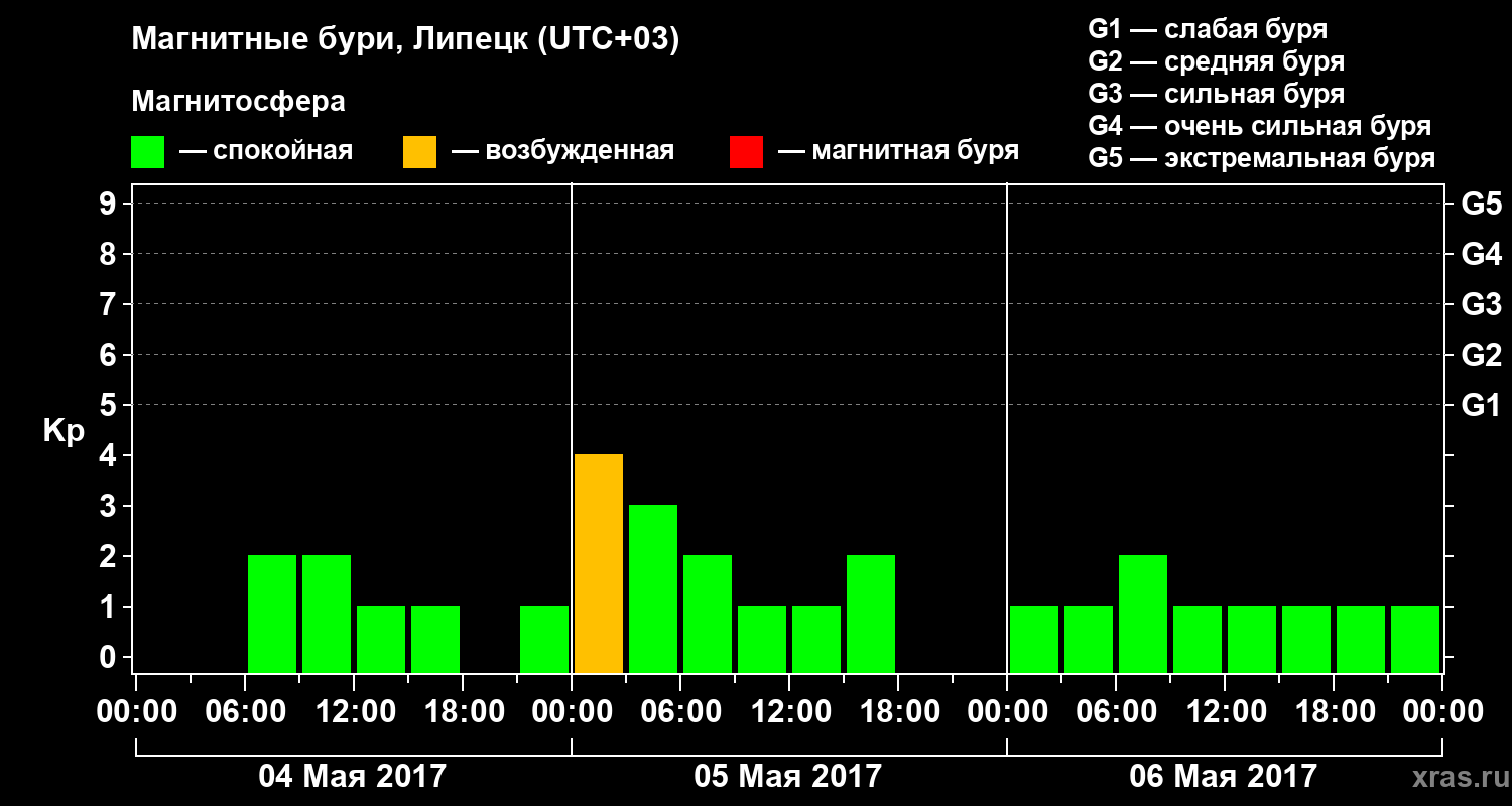 Изменения геомагнитного индекса Kp с 4 по 6 мая 2017 года для средних широт
