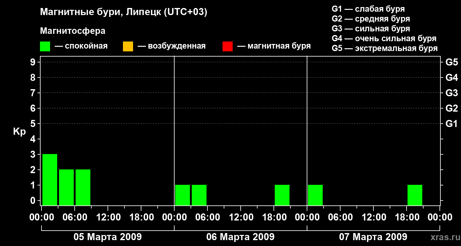 Изменения геомагнитного индекса Kp с 5 по 7 марта 2009 года для средних широт