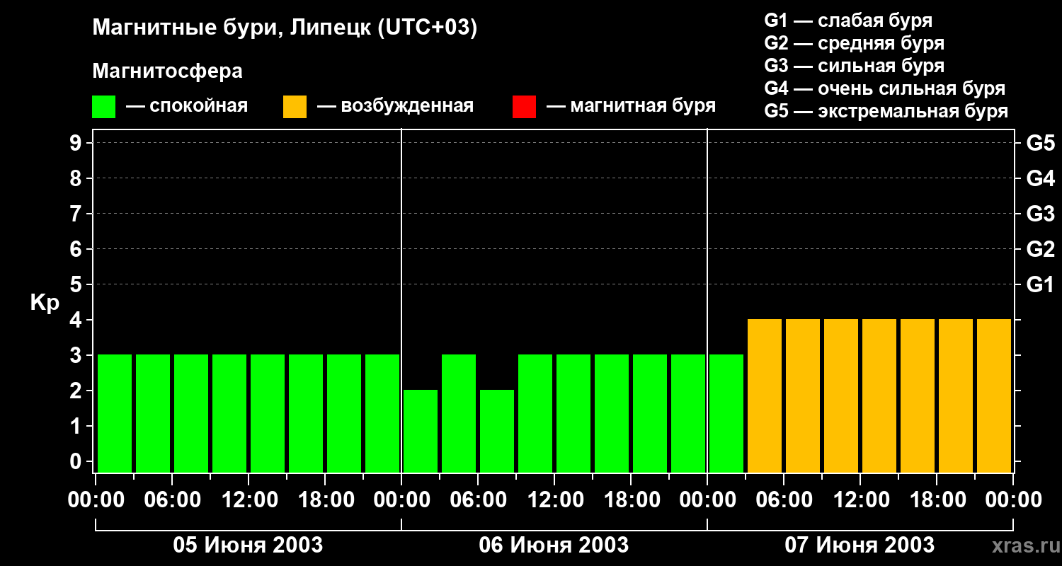 Изменения геомагнитного индекса Kp с 5 по 7 июня 2003 года для средних широт