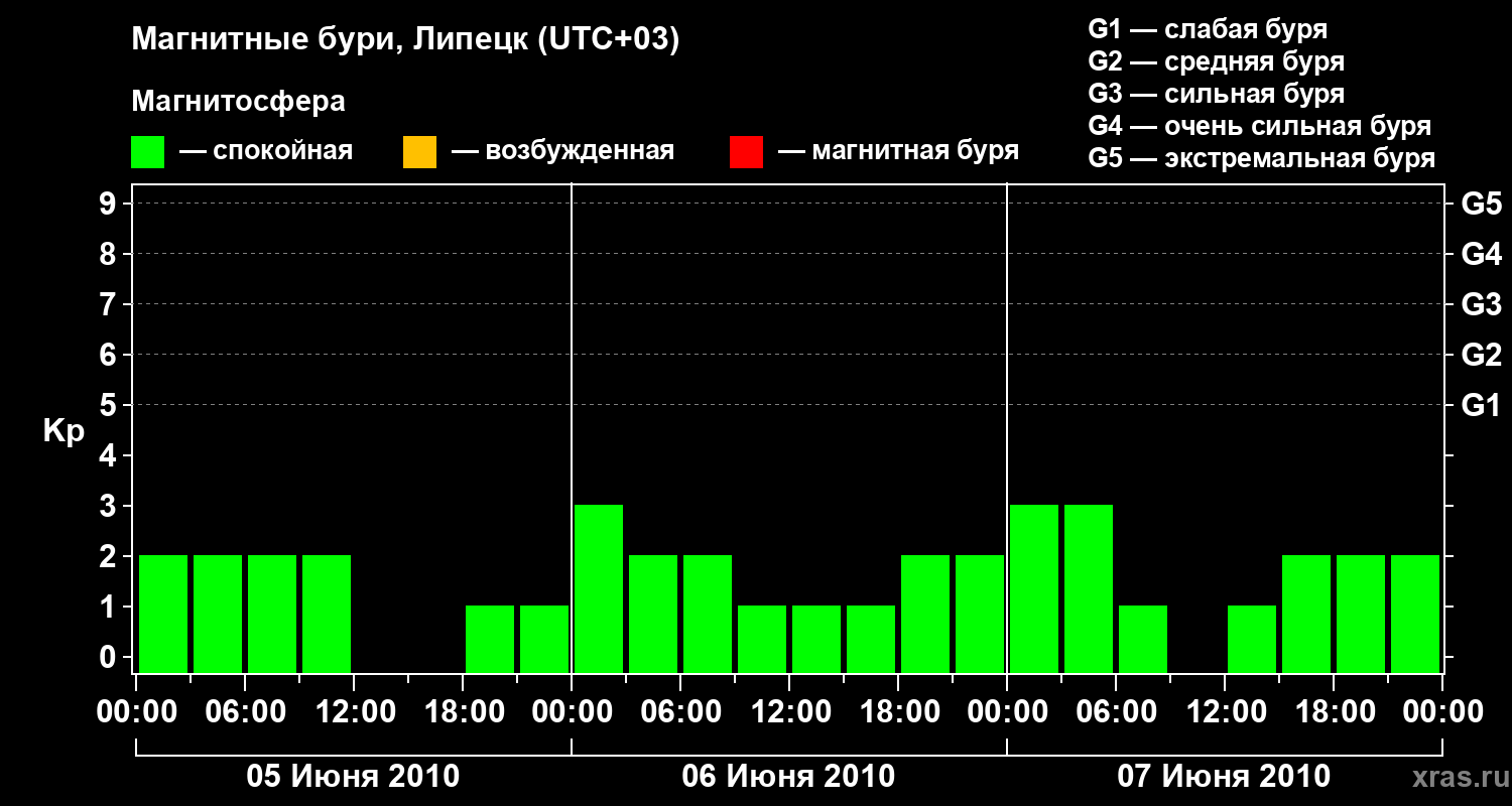 Изменения геомагнитного индекса Kp с 5 по 7 июня 2010 года для средних широт