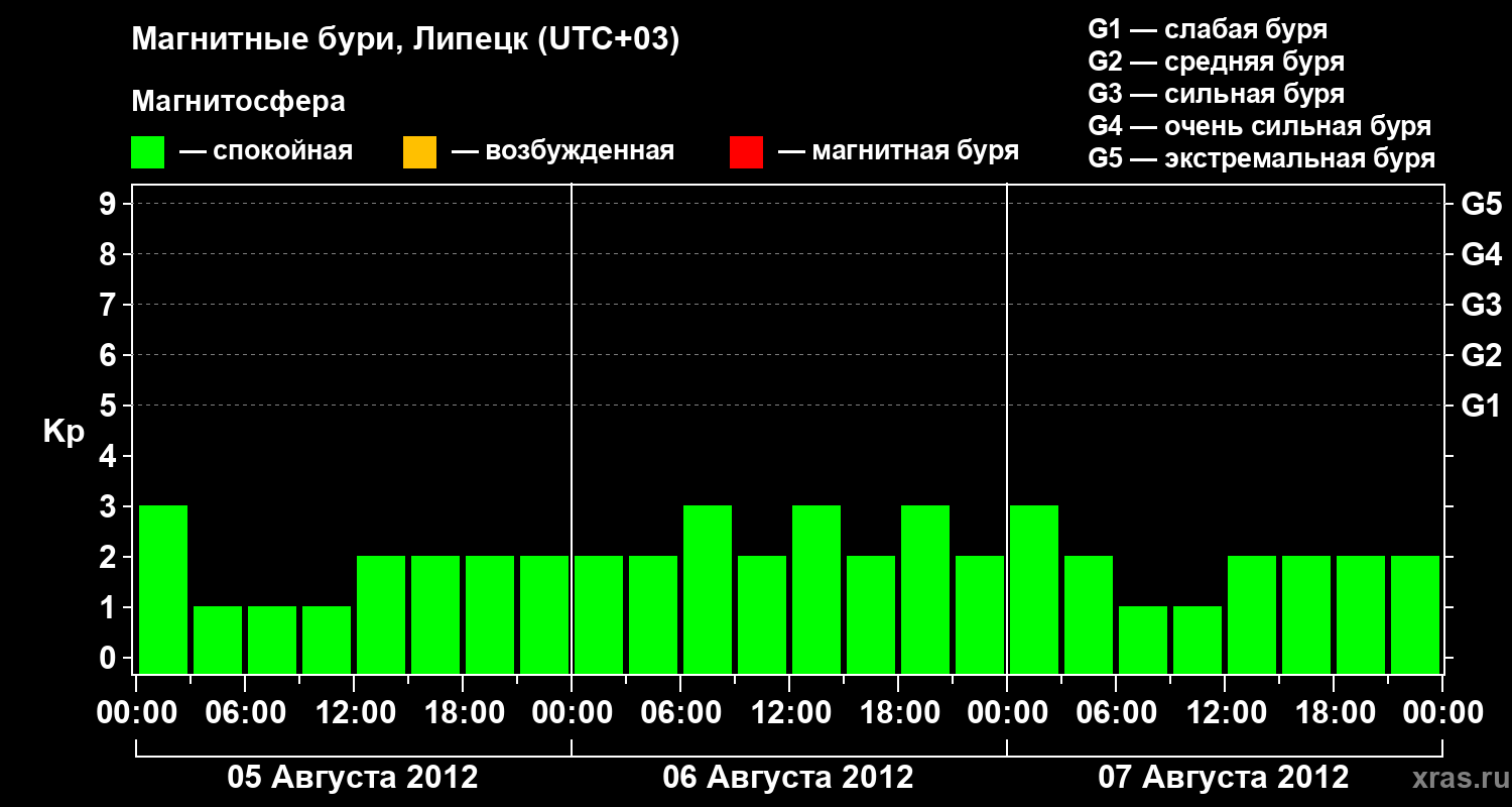 Изменения геомагнитного индекса Kp с 5 по 7 августа 2012 года для средних широт