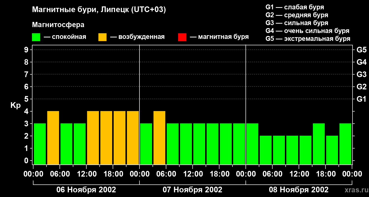 Изменения геомагнитного индекса Kp с 6 по 8 ноября 2002 года для средних широт