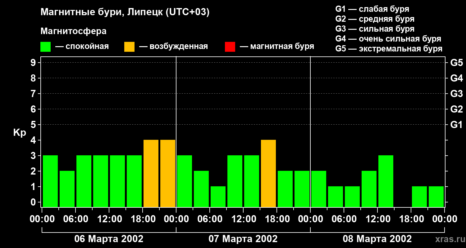 Изменения геомагнитного индекса Kp с 6 по 8 марта 2002 года для средних широт