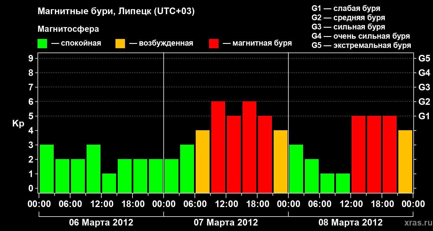 Изменения геомагнитного индекса Kp с 6 по 8 марта 2012 года для средних широт