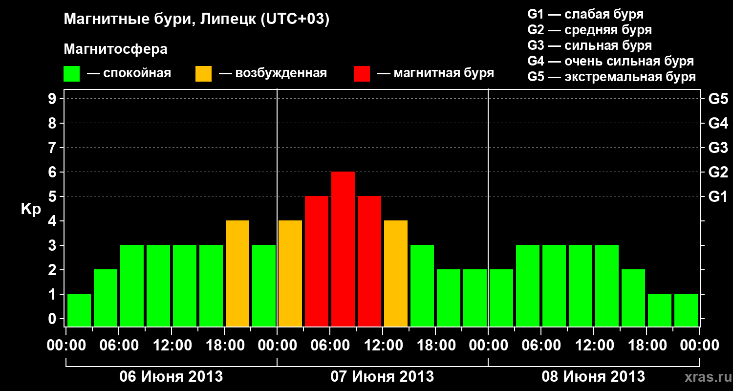 Изменения геомагнитного индекса Kp с 6 по 8 июня 2013 года для средних широт