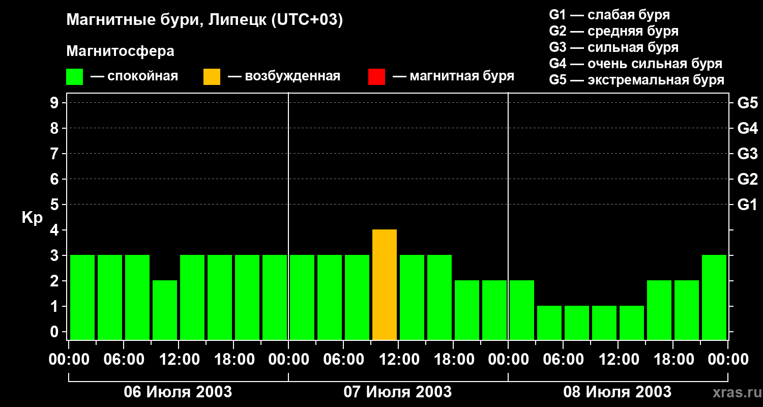Изменения геомагнитного индекса Kp с 6 по 8 июля 2003 года для средних широт