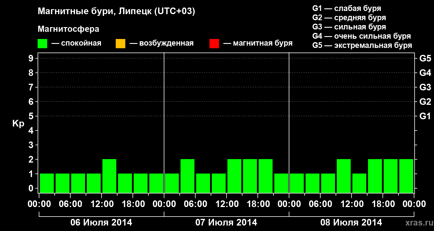 Изменения геомагнитного индекса Kp с 6 по 8 июля 2014 года для средних широт