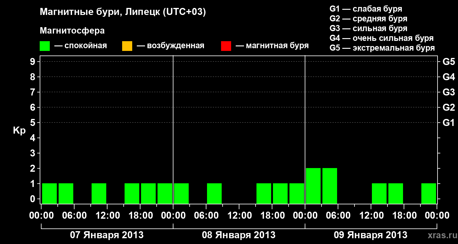 Изменения геомагнитного индекса Kp с 7 по 9 января 2013 года для средних широт