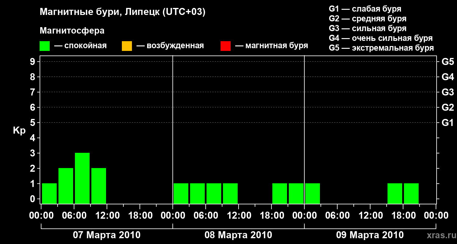 Изменения геомагнитного индекса Kp с 7 по 9 марта 2010 года для средних широт