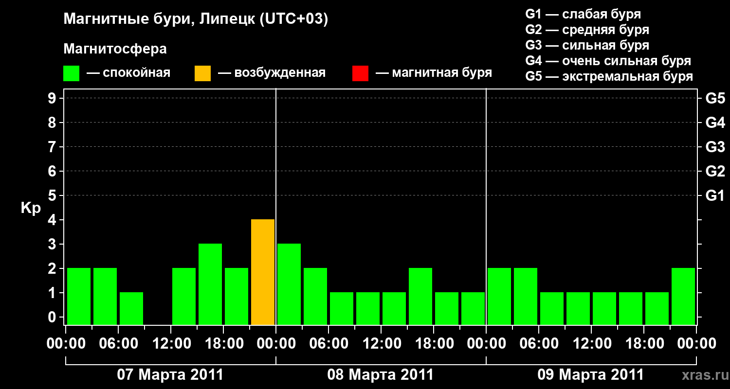 Изменения геомагнитного индекса Kp с 7 по 9 марта 2011 года для средних широт