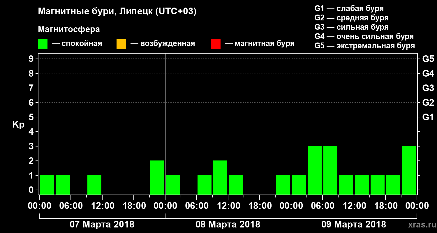 Изменения геомагнитного индекса Kp с 7 по 9 марта 2018 года для средних широт