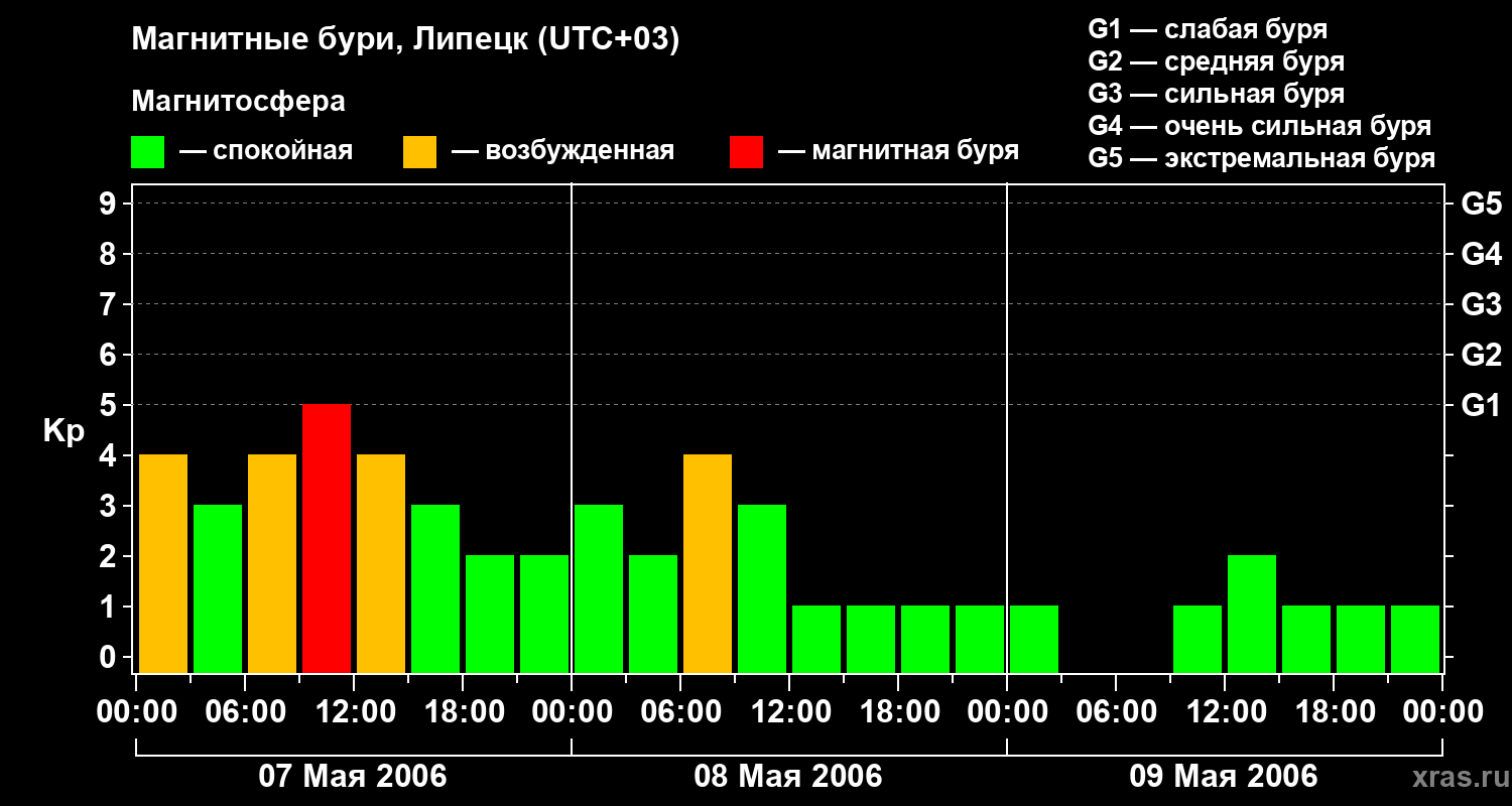 Изменения геомагнитного индекса Kp с 7 по 9 мая 2006 года для средних широт