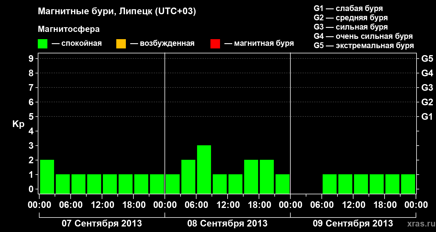 Изменения геомагнитного индекса Kp с 7 по 9 сентября 2013 года для средних широт