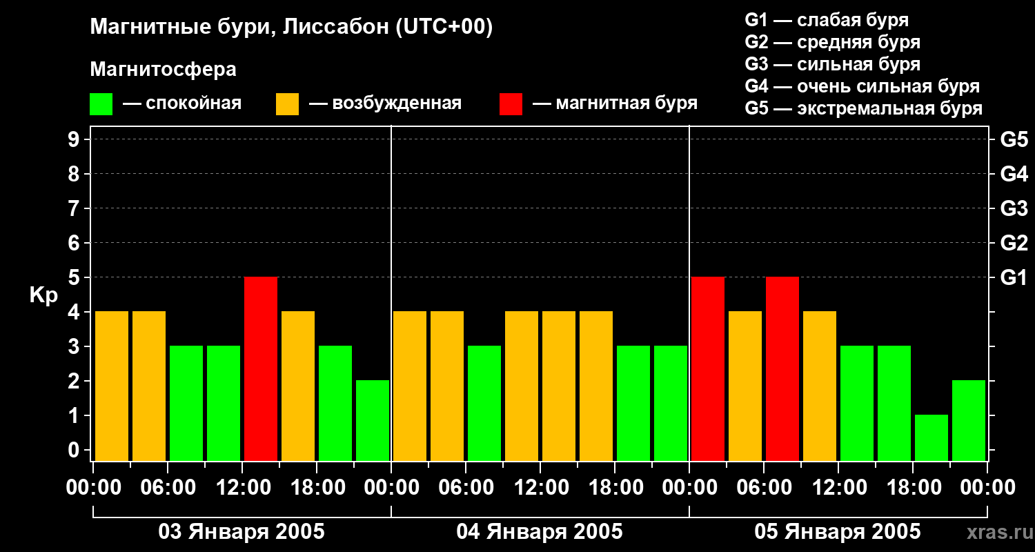 Изменения геомагнитного индекса Kp с 3 по 5 января 2005 года для средних широт