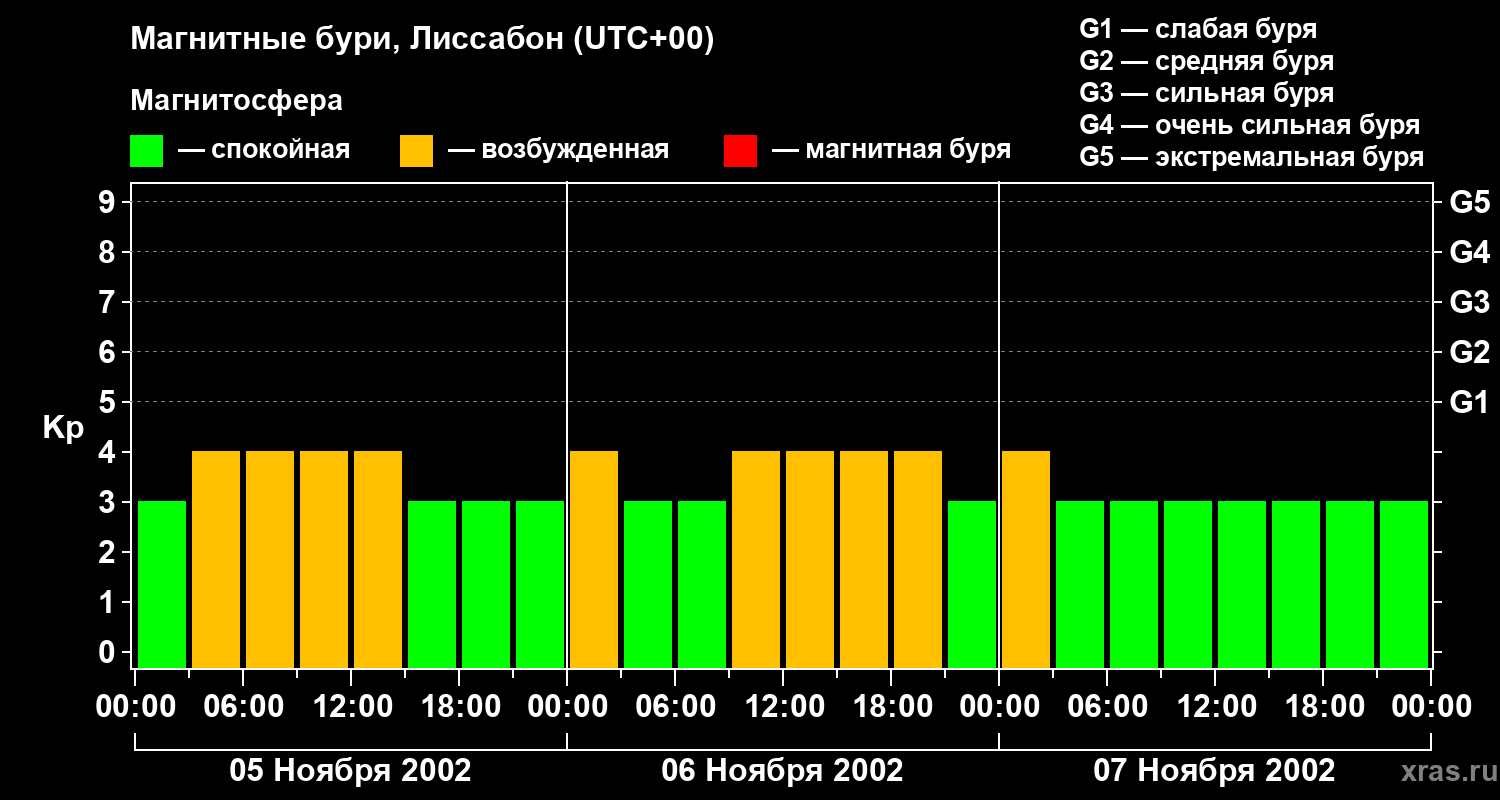 Изменения геомагнитного индекса Kp с 5 по 7 ноября 2002 года для средних широт