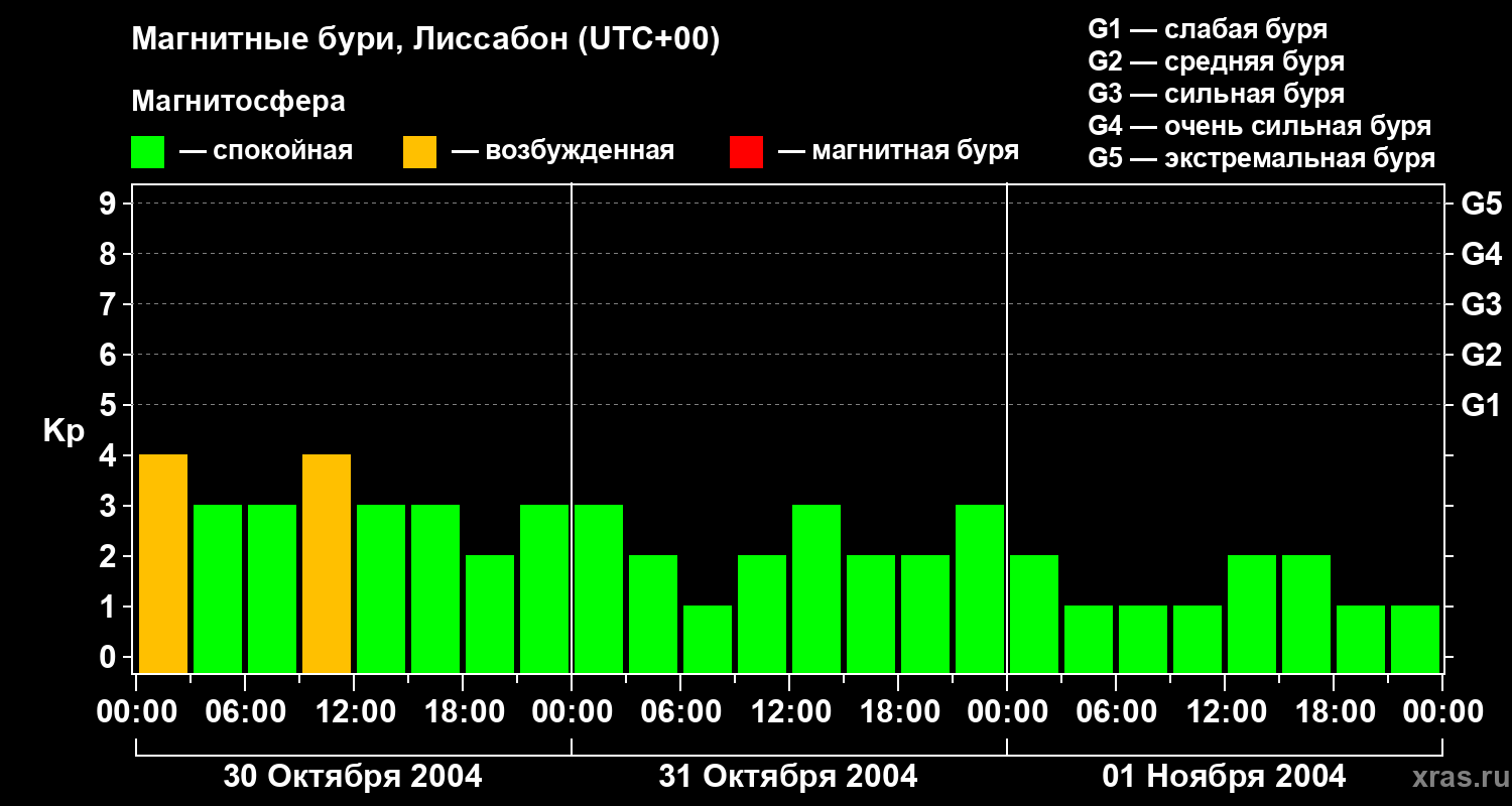 Изменения геомагнитного индекса Kp с 30 октября по 1 ноября 2004 года для средних широт