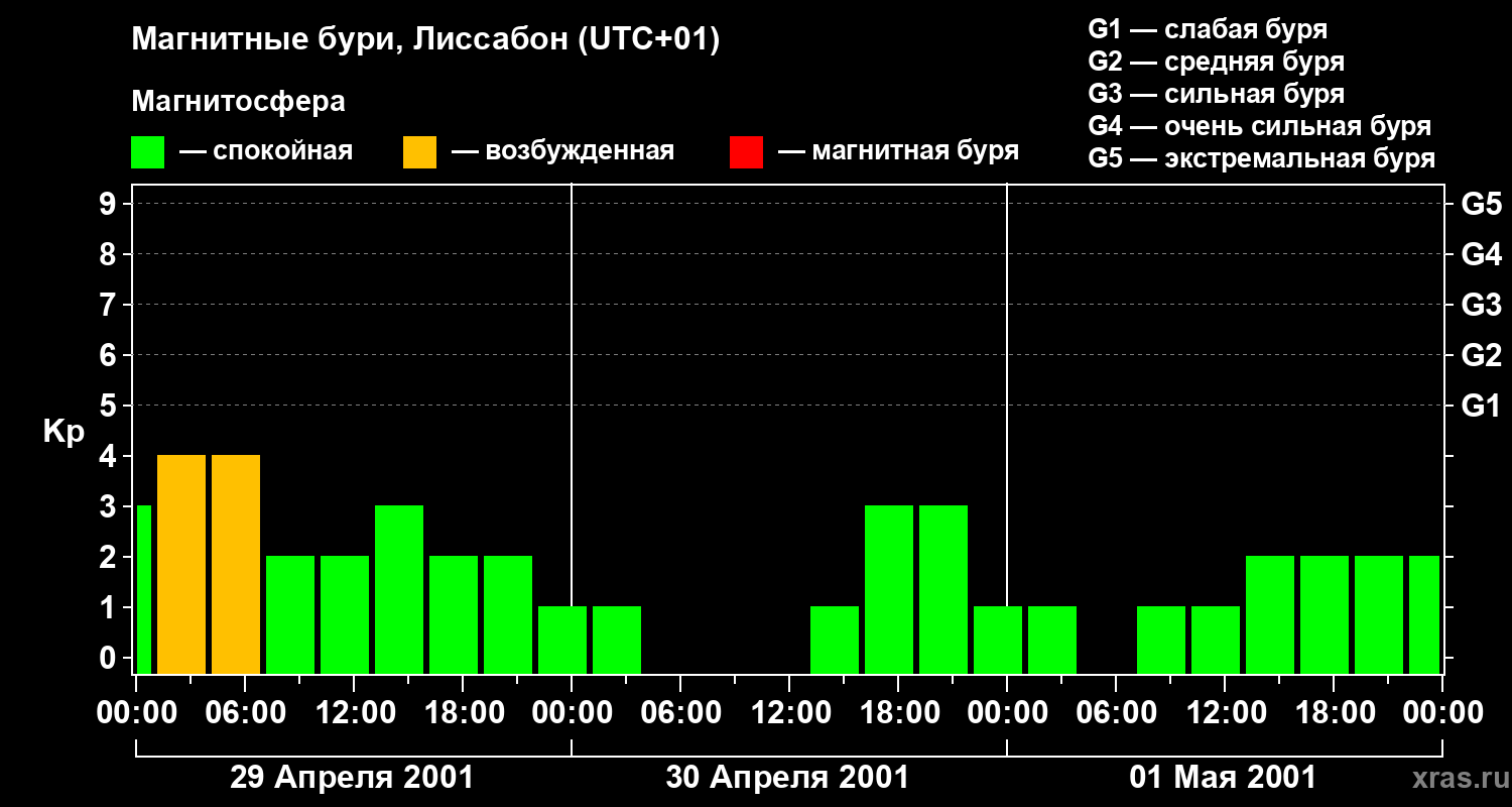Изменения геомагнитного индекса Kp с 29 апреля по 1 мая 2001 года для средних широт