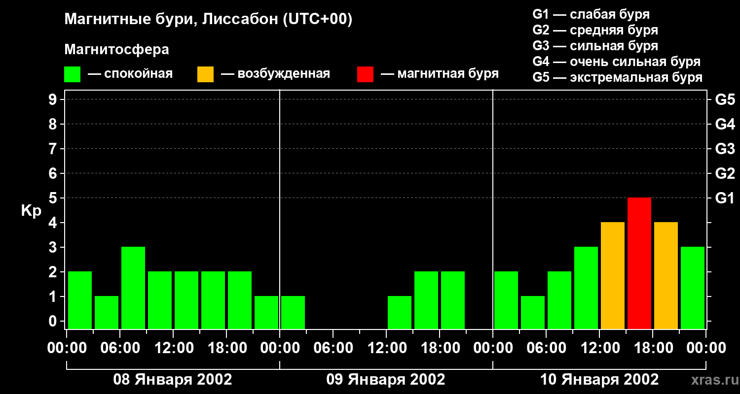 Изменения геомагнитного индекса Kp с 8 по 10 января 2002 года для средних широт