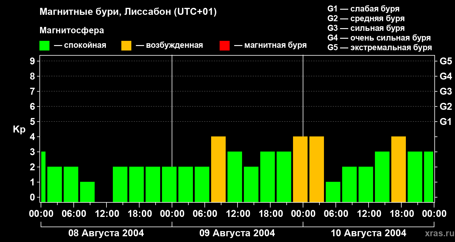 Изменения геомагнитного индекса Kp с 8 по 10 августа 2004 года для средних широт