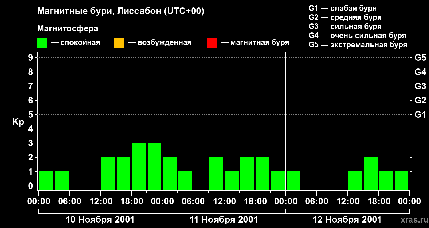 Изменения геомагнитного индекса Kp с 10 по 12 ноября 2001 года для средних широт