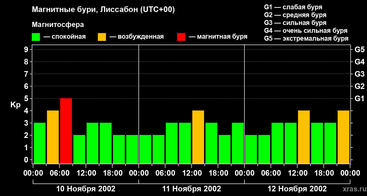 Изменения геомагнитного индекса Kp с 10 по 12 ноября 2002 года для средних широт