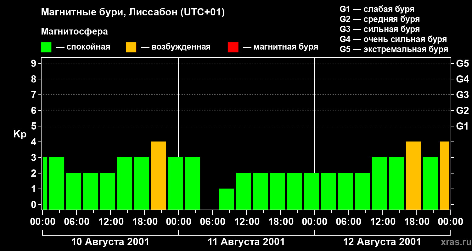 Изменения геомагнитного индекса Kp с 10 по 12 августа 2001 года для средних широт