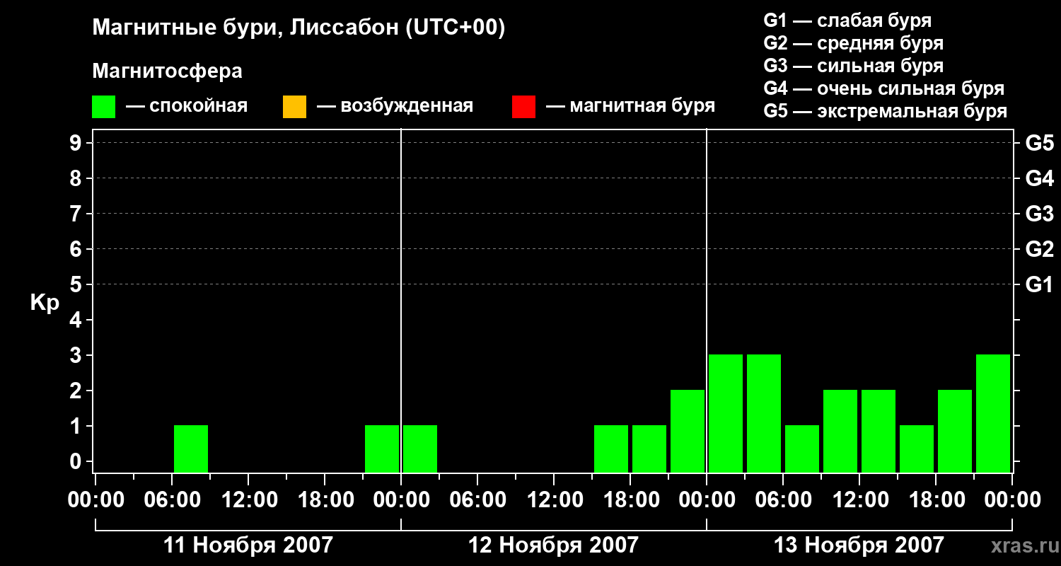Изменения геомагнитного индекса Kp с 11 по 13 ноября 2007 года для средних широт