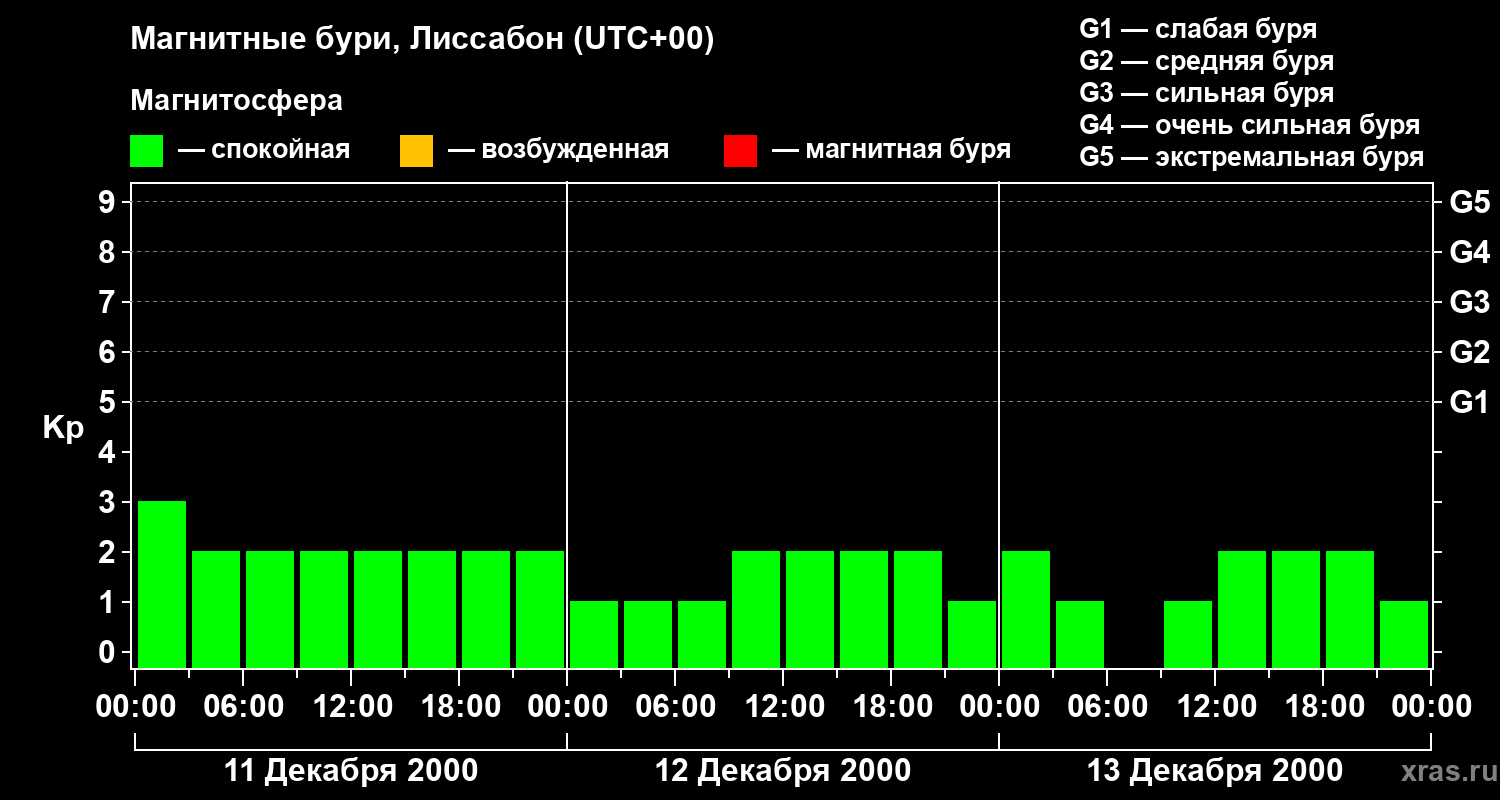 Изменения геомагнитного индекса Kp с 11 по 13 декабря 2000 года для средних широт
