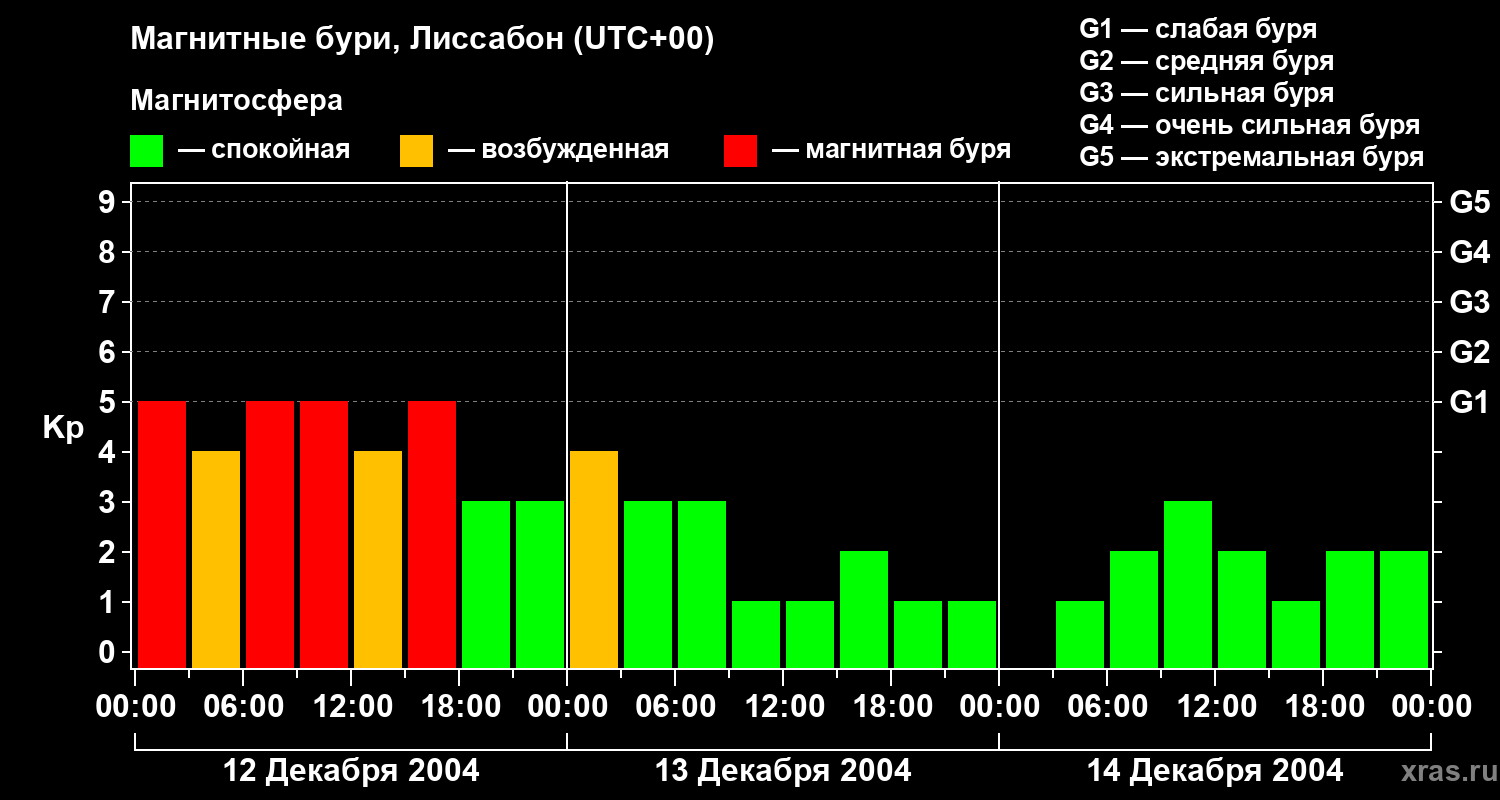 Изменения геомагнитного индекса Kp с 12 по 14 декабря 2004 года для средних широт