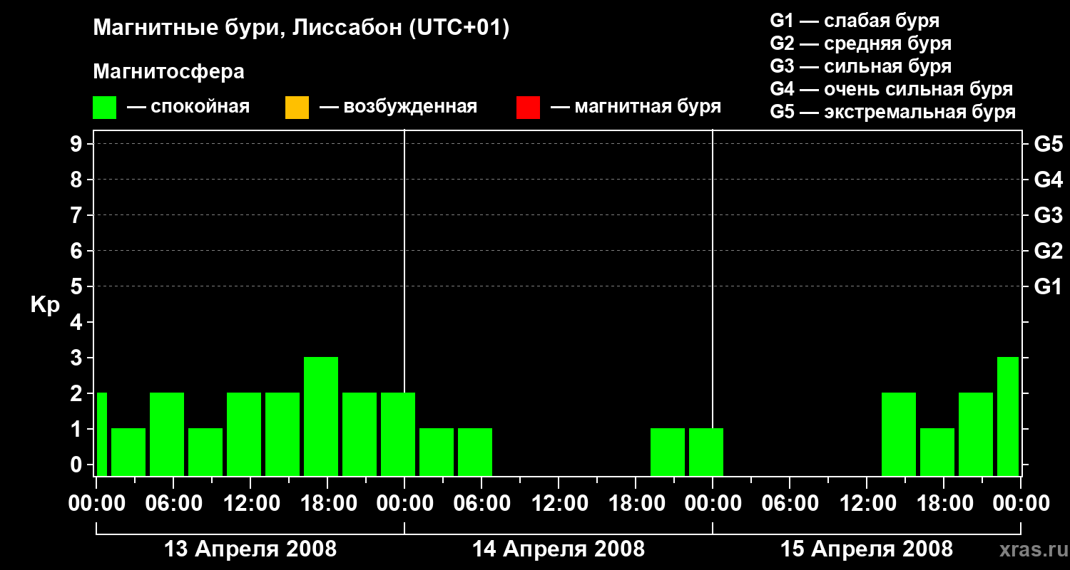 Изменения геомагнитного индекса Kp с 13 по 15 апреля 2008 года для средних широт