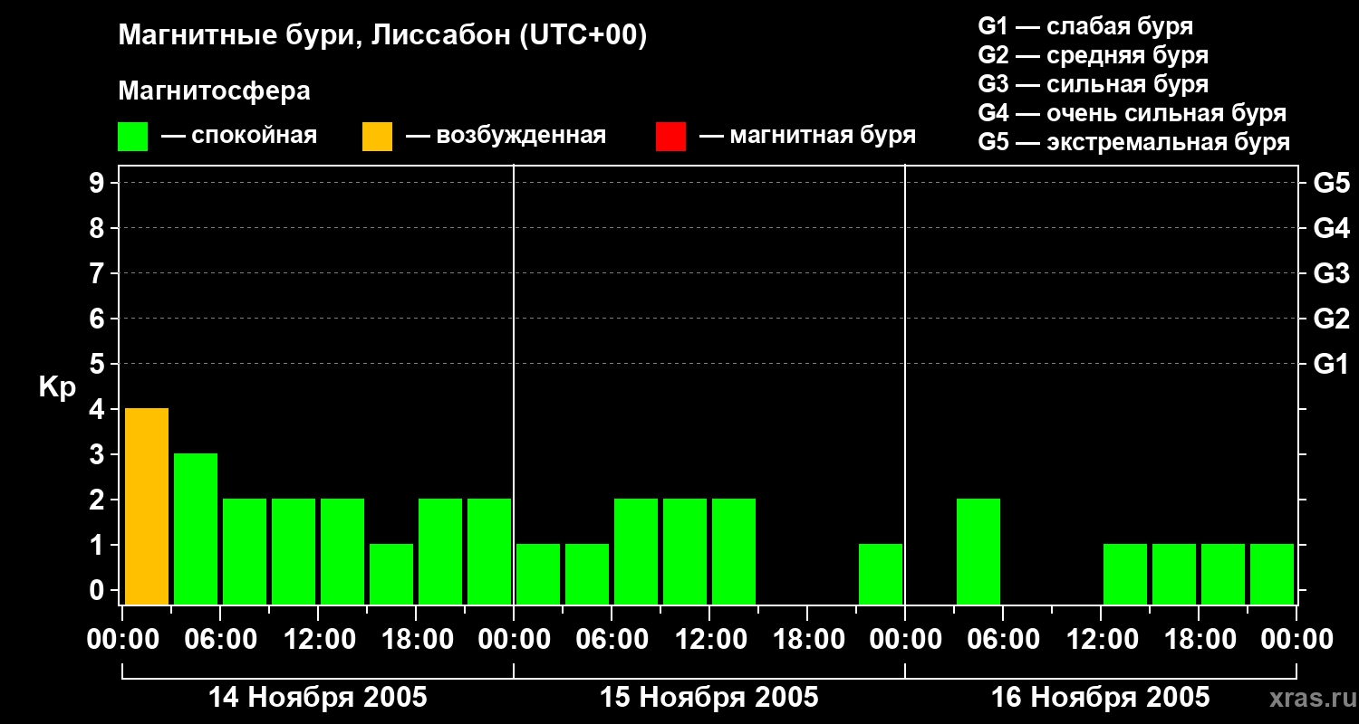Изменения геомагнитного индекса Kp с 14 по 16 ноября 2005 года для средних широт