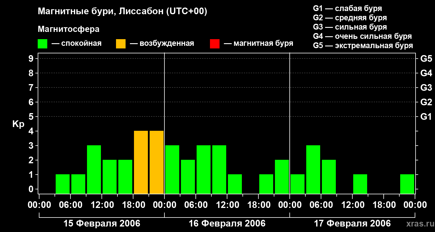 Изменения геомагнитного индекса Kp с 15 по 17 февраля 2006 года для средних широт