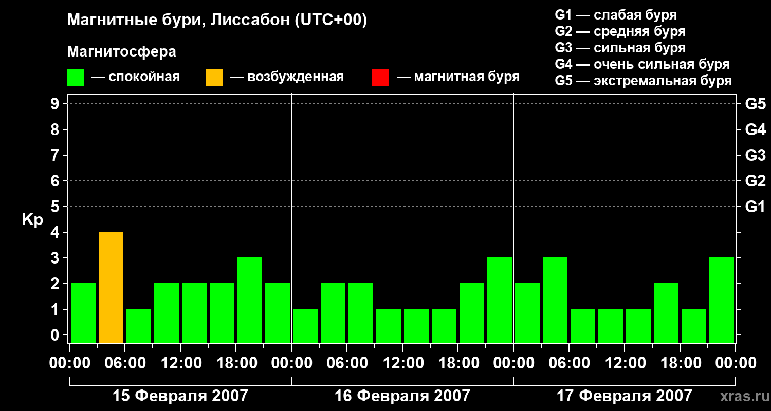 Изменения геомагнитного индекса Kp с 15 по 17 февраля 2007 года для средних широт