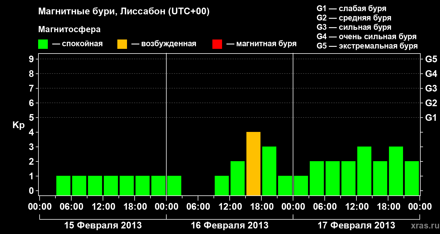 Изменения геомагнитного индекса Kp с 15 по 17 февраля 2013 года для средних широт
