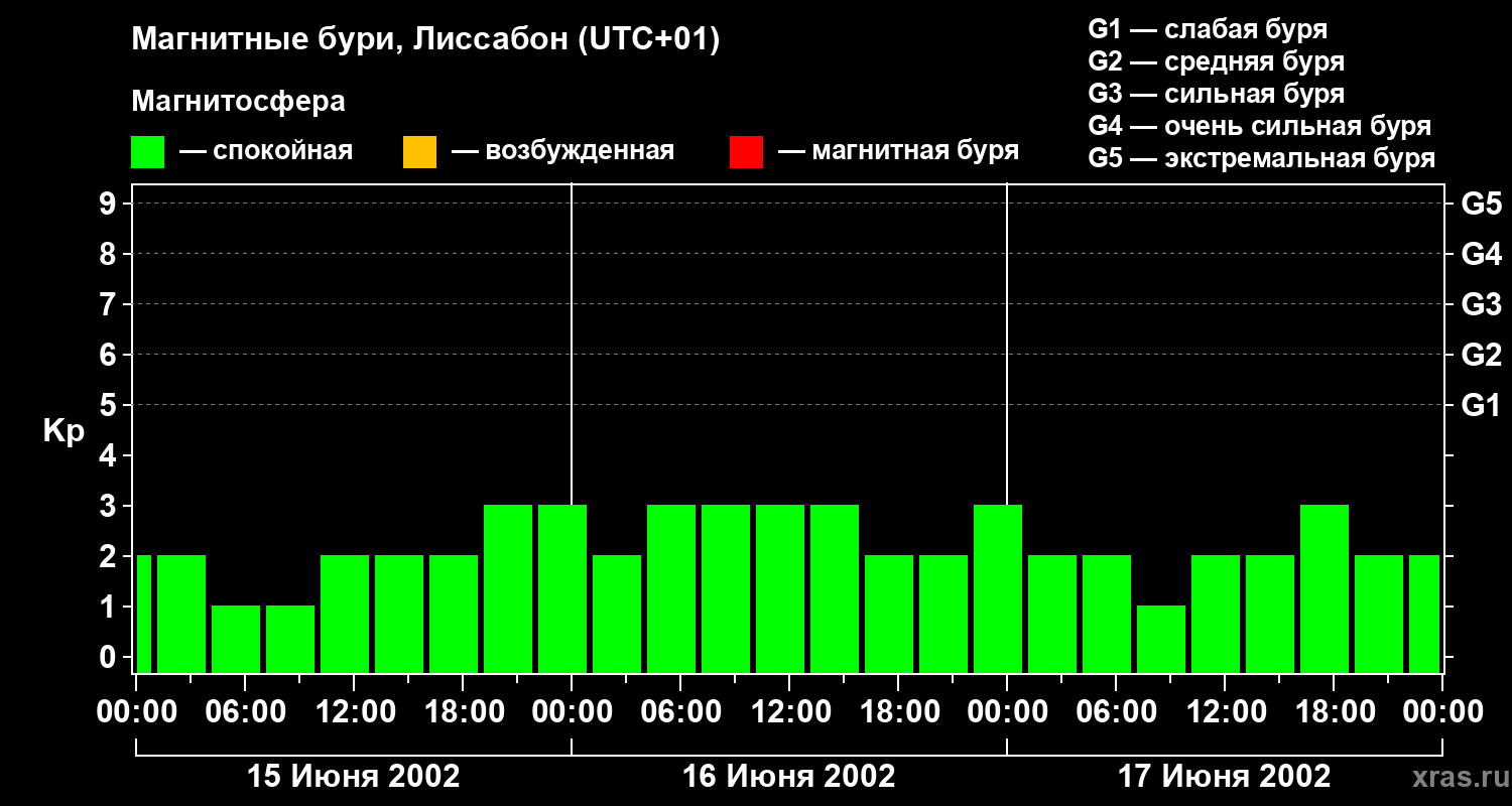 Изменения геомагнитного индекса Kp с 15 по 17 июня 2002 года для средних широт