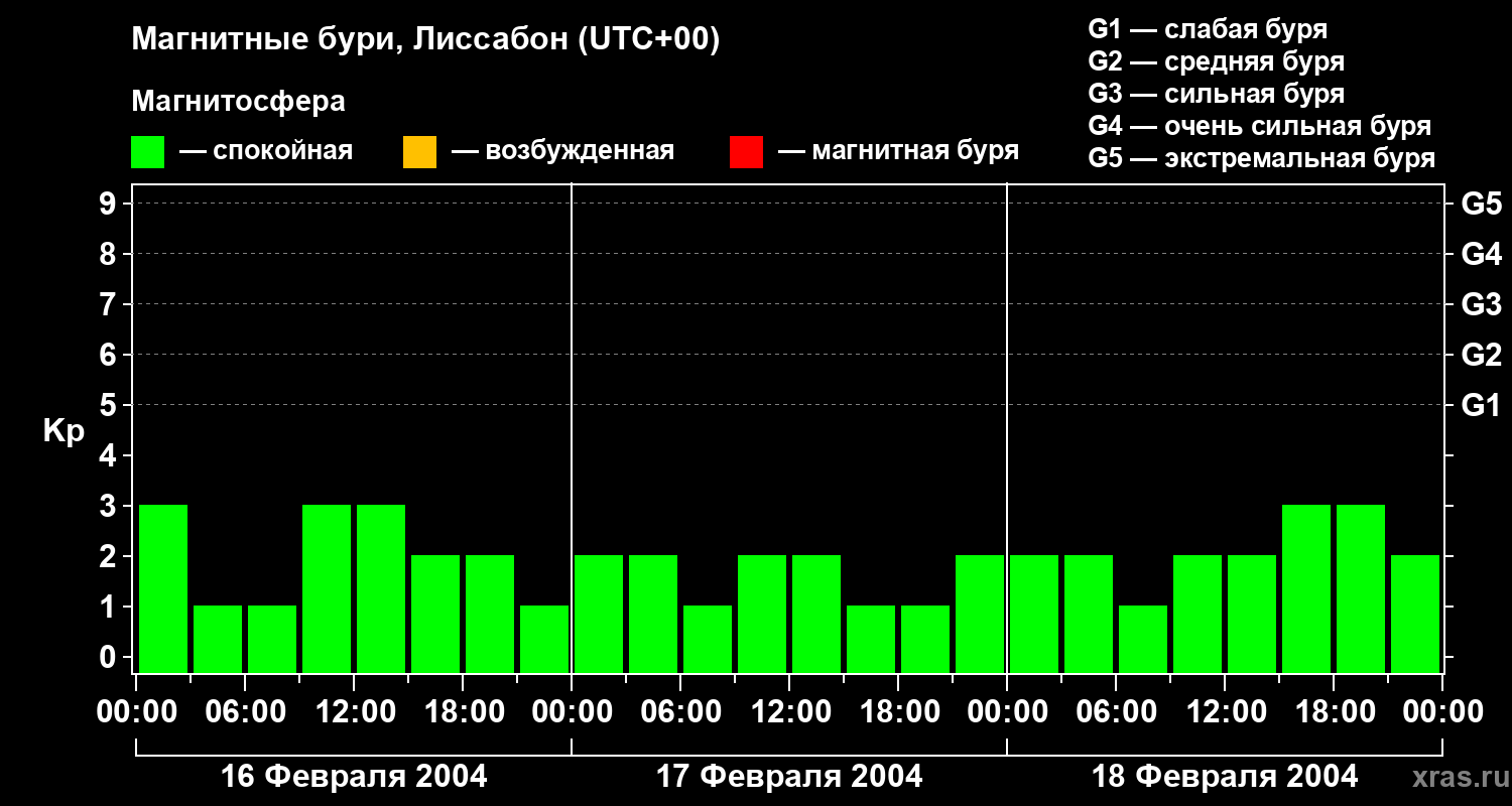 Изменения геомагнитного индекса Kp с 16 по 18 февраля 2004 года для средних широт