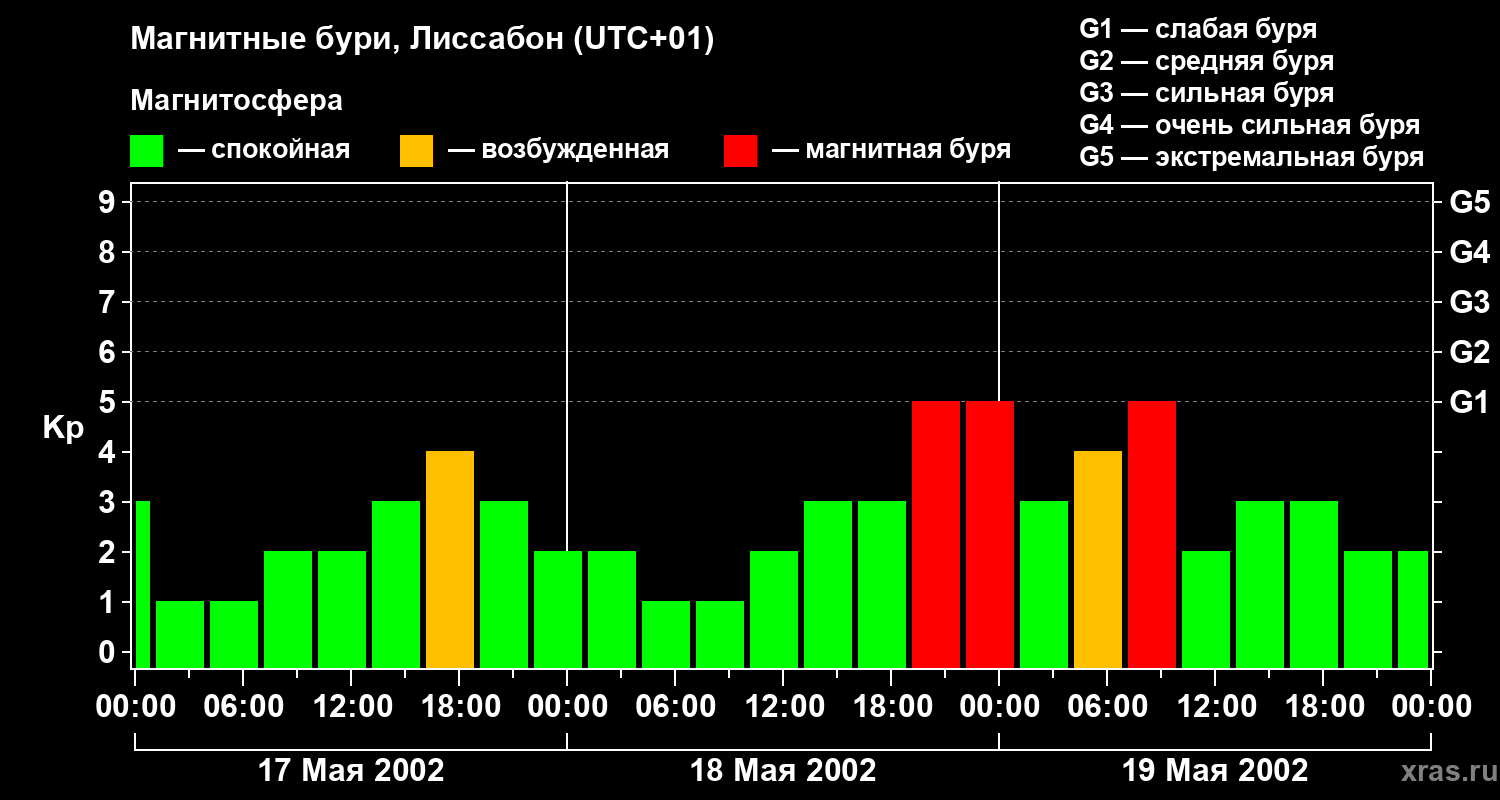 Изменения геомагнитного индекса Kp с 17 по 19 мая 2002 года для средних широт