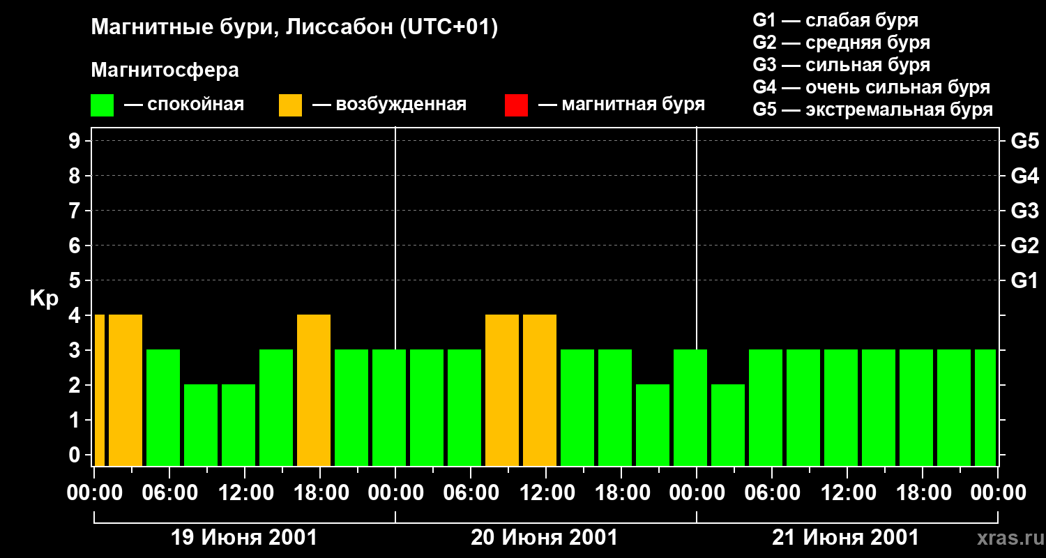 Изменения геомагнитного индекса Kp с 19 по 21 июня 2001 года для средних широт