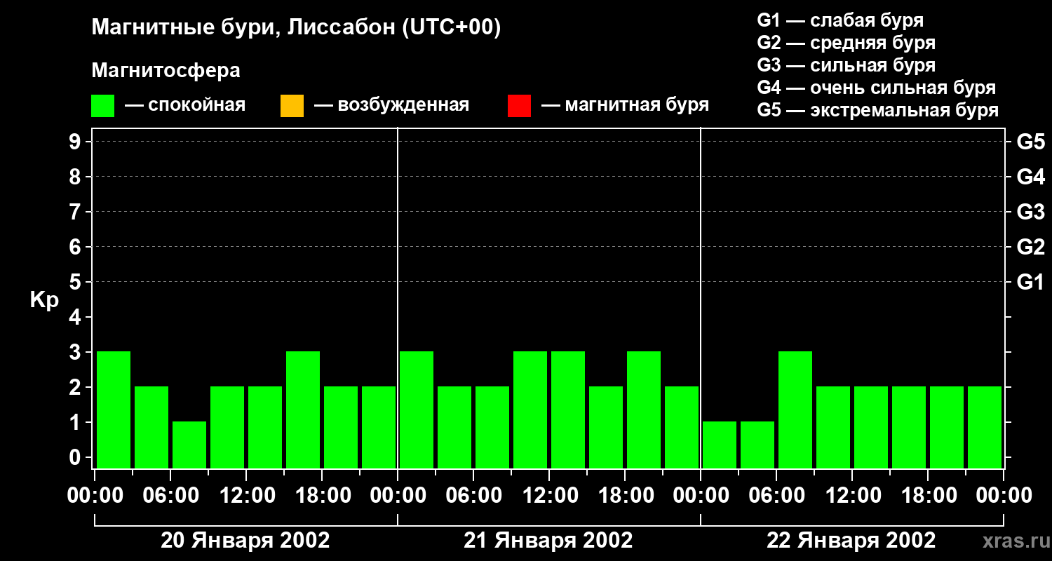 Изменения геомагнитного индекса Kp с 20 по 22 января 2002 года для средних широт