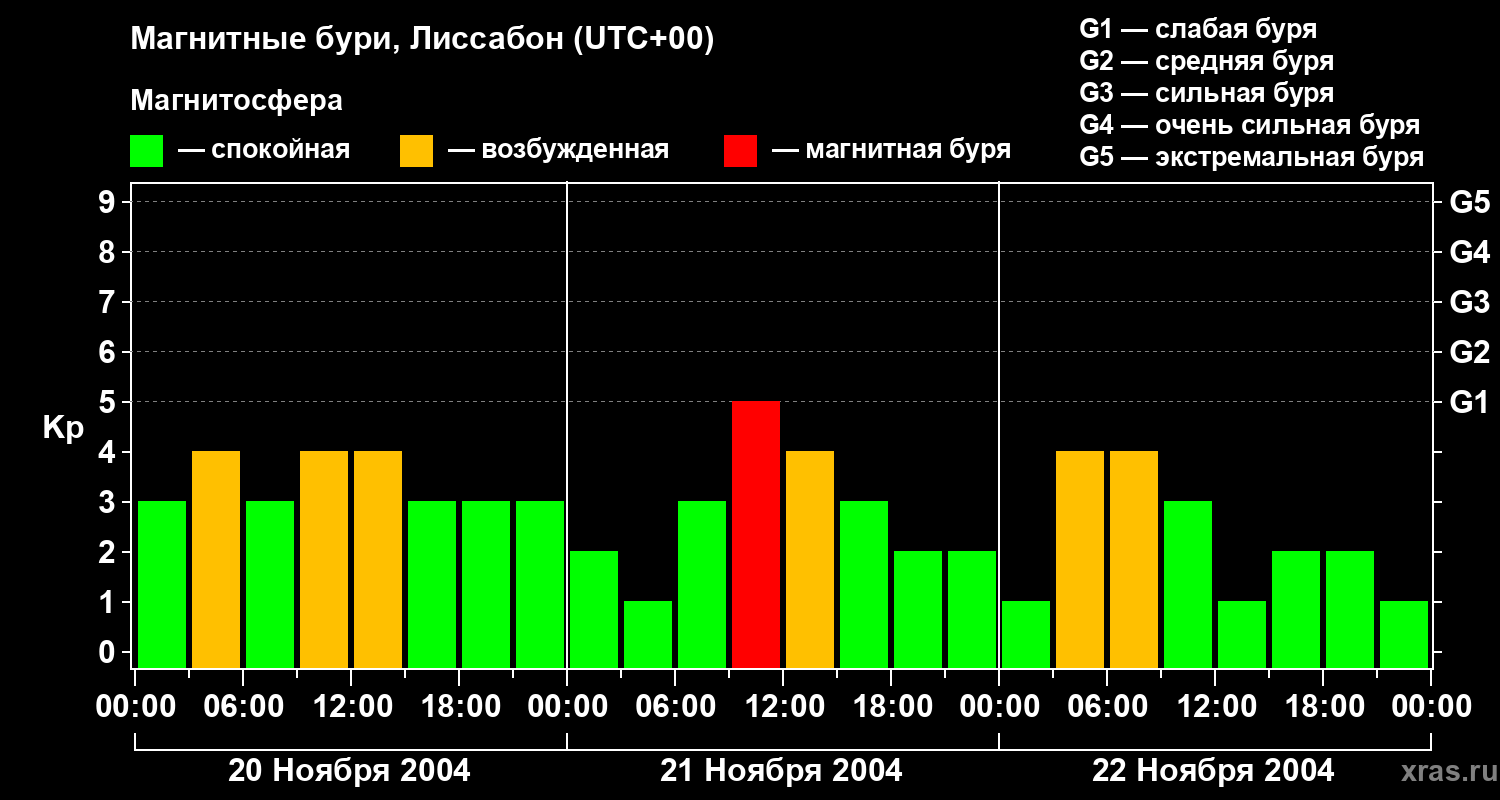 Изменения геомагнитного индекса Kp с 20 по 22 ноября 2004 года для средних широт